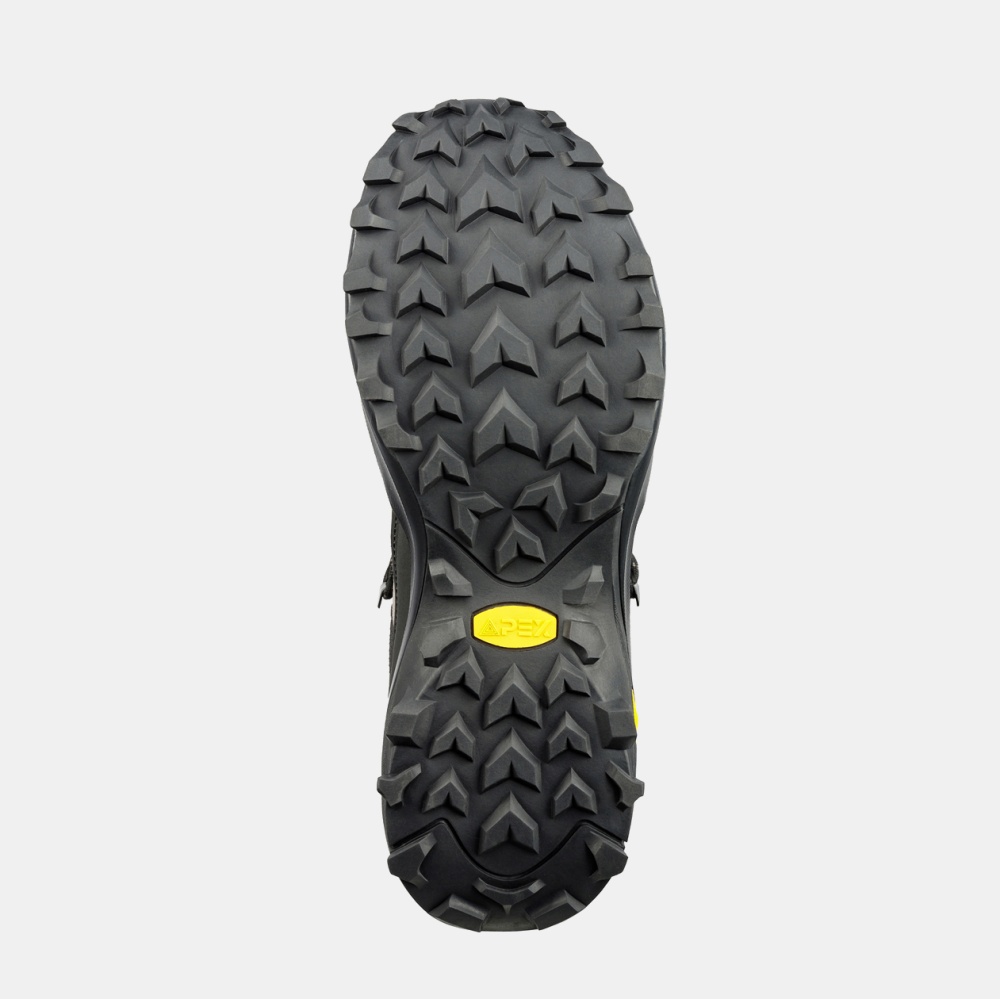 Верх ботинок выполнен из сочетания натуральной кожи, износостойкого ТПУ и прочной ткани, обеспечивая надёжную защиту, гибкость и вентиляцию. Мембрана APEX-TEX внутри обуви гарантирует влагозащиту и воздухопроницаемость, позволяя ногам оставаться сухими даже при интенсивной активности или неблагоприятной погоде.